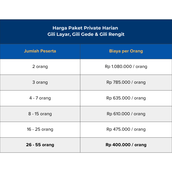 | 15.00 – 16.00 | : | Kembali ke pelabuhan dan bilas |