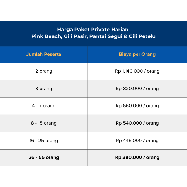 | 15.30 – 17.00 | : | Kembali ke Pelabuhan & bilas |