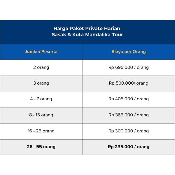 | 13.30 – 14.30 | : | Tour ke Pantai Kuta Mandalika / Landmark Sirkuit Mandalika |