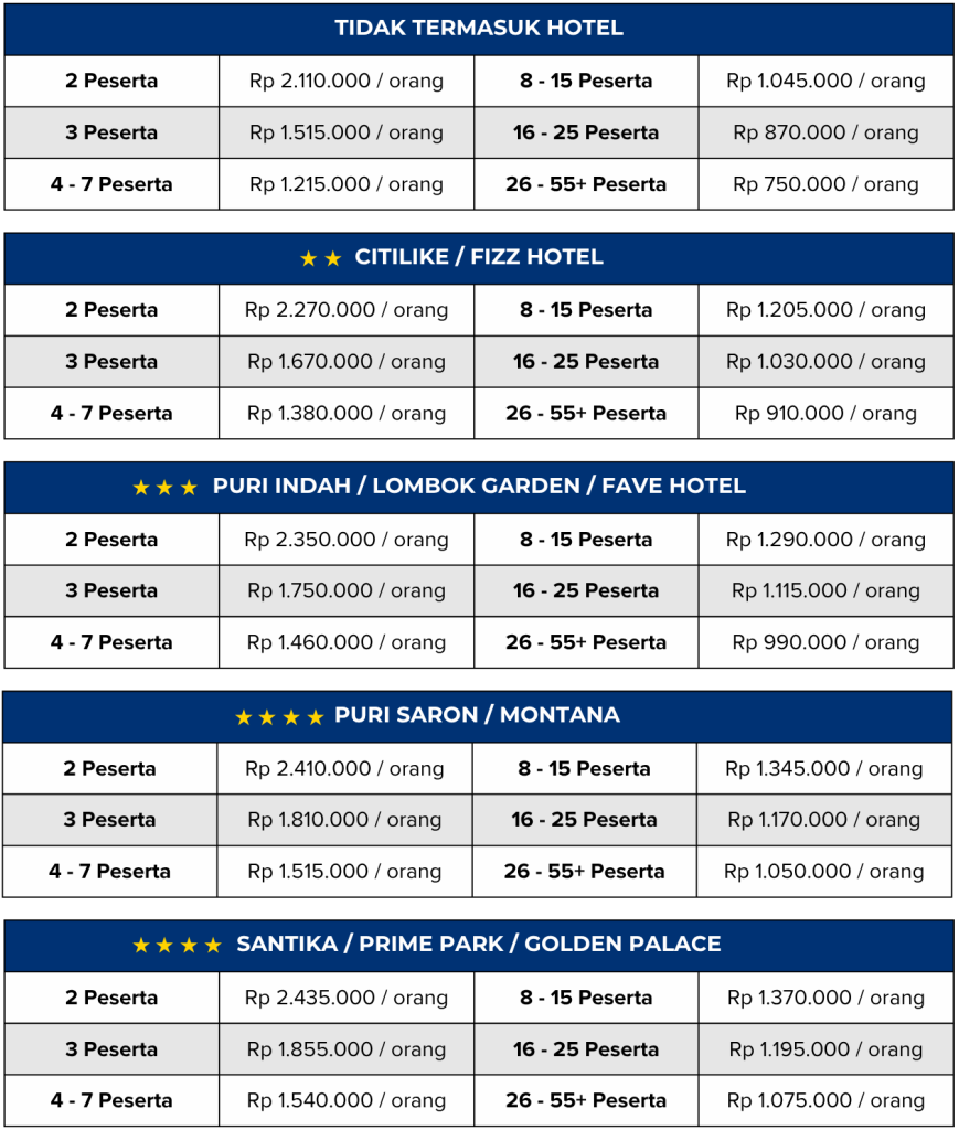 | 16.00 – 17.30 | : | Pengantaran ke Bandara Internasional Lombok |