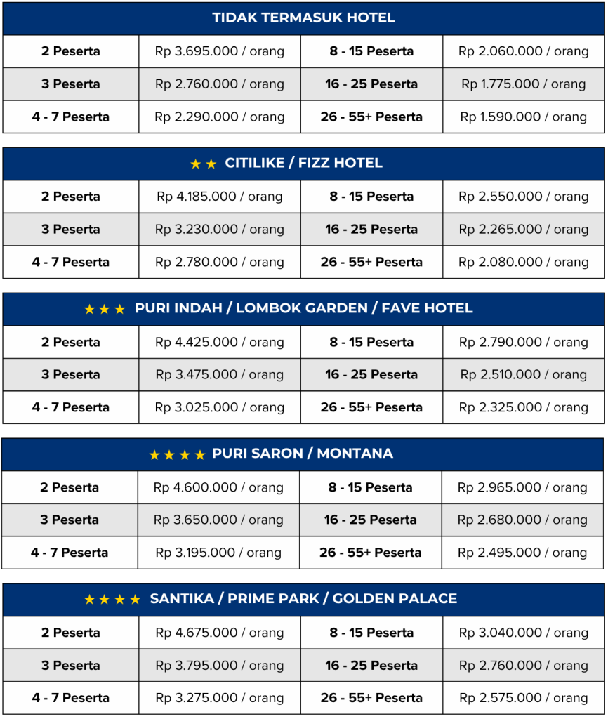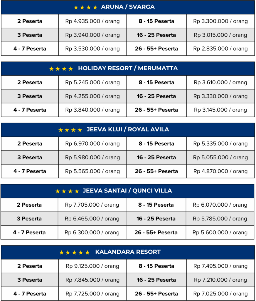 * Harga diatas untuk periode low season berdasarkan harga kamar dengan tipe terendah