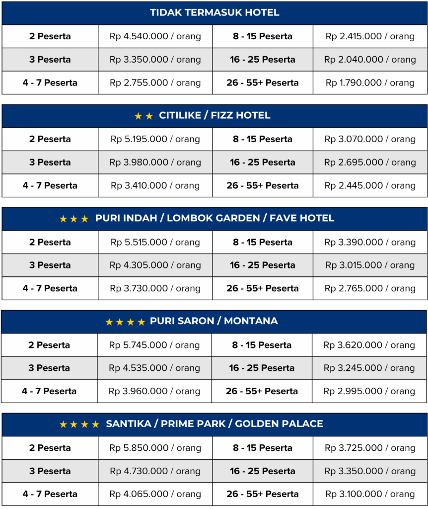 Paket tour lombok ini adalah paket wisata lombok yang kami tawarkan dengan durasi 5 hari 4 malam dengan budget mulai dari Rp 1.790.000. Berikut adalah detail dari Paket Tour dan Wisata Lombok 5 Hari 4 Malam (A):