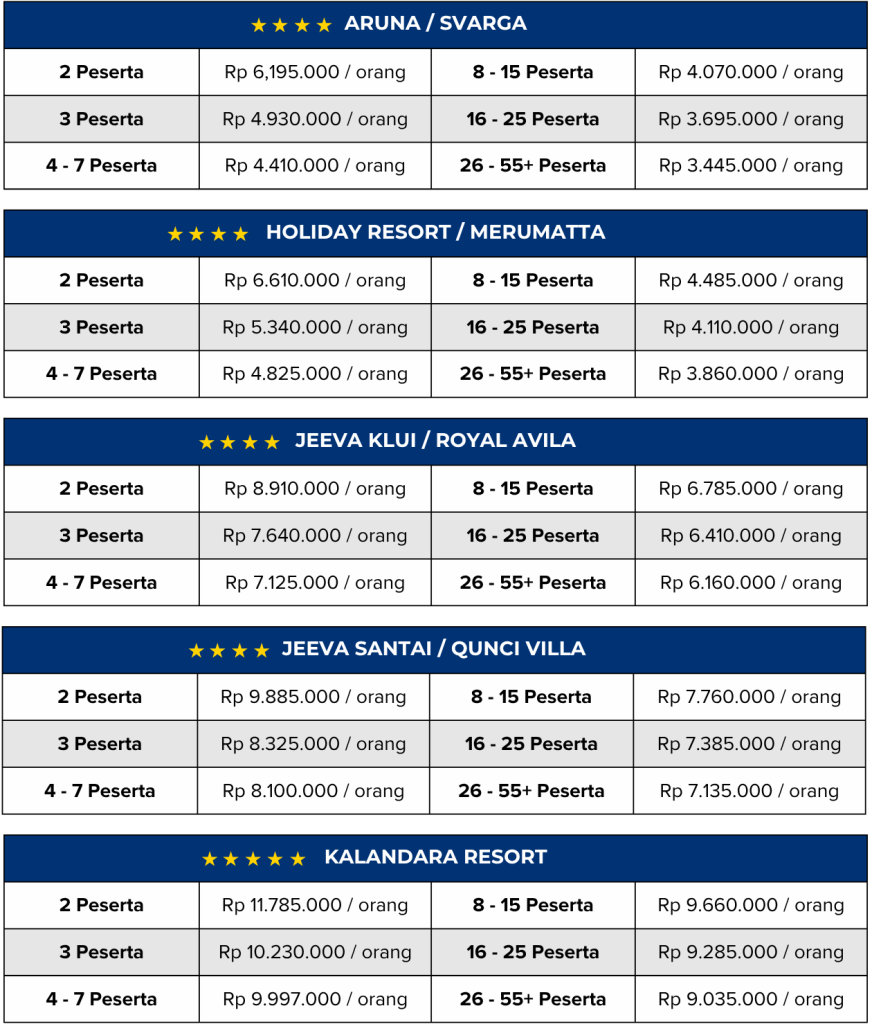 * Harga diatas untuk periode low season berdasarkan harga kamar dengan tipe terendah
